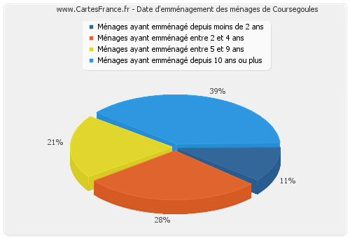 - Nombre de ménages de Coursegoules ayant emménagé depuis 10 ans ou plus : 76