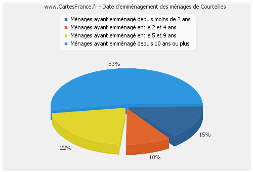 - Nombre de ménages de Courteilles ayant emménagé depuis 10 ans ou plus : 32