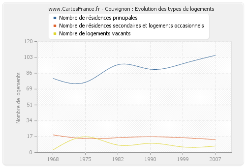 En 2007 les logements de Couvignon étaient composés de 105 résidences principales, 14 résidences secondaires ou occasionnels ainsi que 7 logements vacants.