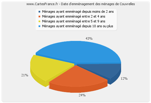 - Nombre de ménages de Couvrelles ayant emménagé depuis 10 ans ou plus : 33