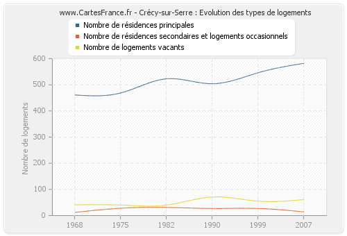 Les graphiques suivant reprennent l'historique du nombre et du type de logements de Crécy-sur-Serre de 1968 à 2007. Le deuxième graphique est tracé en interpolation cubique. Ceci permet d'obtenir plus précisément le nombre de logement du village de Crécy-sur-Serre les années ou aucun recensement n'a été effectué.