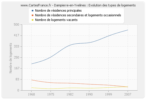 Les graphiques suivant reprennent l'historique du nombre et du type de logements de Dampierre-en-Yvelines de 1968 à 2007. Le deuxième graphique est tracé en interpolation cubique. Ceci permet d'obtenir plus précisément le nombre de logement du village de Dampierre-en-Yvelines les années ou aucun recensement n'a été effectué.