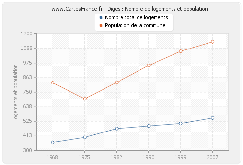 La population de Diges était de 1 138 habitants en 2007, 1 065 habitants en 1999, 956 habitants en 1990, 825 habitants en 1982, 699 habitants en 1975 et 823 habitants en 1968. Parallèlement, le nombre de logements de Diges était de 551 en 2007, 509 en 1999, 490 en 1990, 470 en 1982, 402 en 1975 et 364 en 1968.