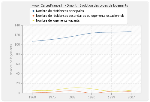 En 2007 les logements de Dimont étaient composés de 127 résidences principales, 3 résidences secondaires ou occasionnels ainsi que 6 logements vacants.