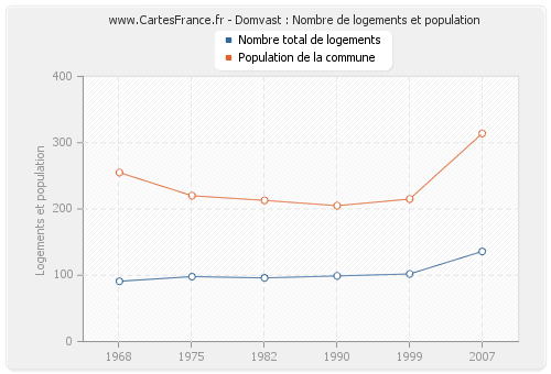 La population de Domvast était de 314 habitants en 2007, 215 habitants en 1999, 205 habitants en 1990, 213 habitants en 1982, 220 habitants en 1975 et 255 habitants en 1968. Parallèlement, le nombre de logements de Domvast était de 136 en 2007, 102 en 1999, 99 en 1990, 96 en 1982, 98 en 1975 et 91 en 1968.