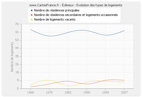Les graphiques suivant reprennent l'historique du nombre et du type de logements d'Éclimeux de 1968 à 2007. Le deuxième graphique est tracé en interpolation cubique. Ceci permet d'obtenir plus précisément le nombre de logement du village d'Éclimeux les années ou aucun recensement n'a été effectué.