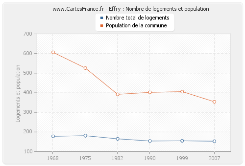 La population d'Effry était de 354 habitants en 2007, 406 habitants en 1999, 402 habitants en 1990, 392 habitants en 1982, 526 habitants en 1975 et 606 habitants en 1968. Parallèlement, le nombre de logements d'Effry était de 153 en 2007, 155 en 1999, 154 en 1990, 165 en 1982, 181 en 1975 et 178 en 1968.
