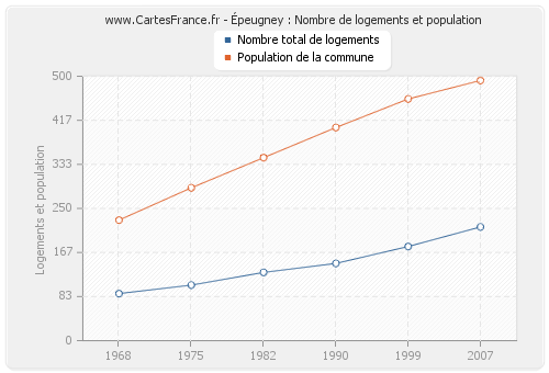 La population d'Épeugney était de 492 habitants en 2007, 457 habitants en 1999, 403 habitants en 1990, 346 habitants en 1982, 289 habitants en 1975 et 228 habitants en 1968. Parallèlement, le nombre de logements d'Épeugney était de 215 en 2007, 178 en 1999, 146 en 1990, 129 en 1982, 105 en 1975 et 89 en 1968.