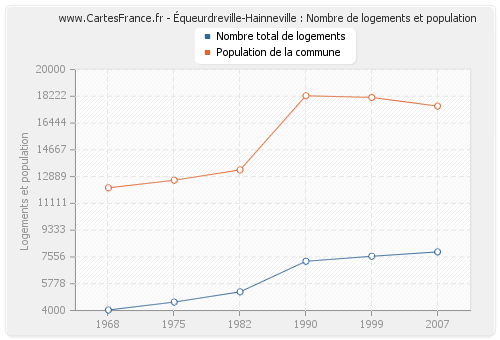 La population d'Équeurdreville-Hainneville était de 17 569 habitants en 2007, 18 146 habitants en 1999, 18 256 habitants en 1990, 13 332 habitants en 1982, 12 647 habitants en 1975 et 12 145 habitants en 1968. Parallèlement, le nombre de logements d'Équeurdreville-Hainneville était de 7 891 en 2007, 7 599 en 1999, 7 268 en 1990, 5 238 en 1982, 4 559 en 1975 et 4 034 en 1968.