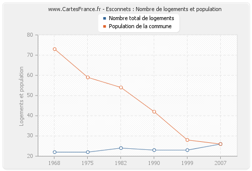 La population d'Esconnets était de 26 habitants en 2007, 28 habitants en 1999, 42 habitants en 1990, 54 habitants en 1982, 59 habitants en 1975 et 73 habitants en 1968. Parallèlement, le nombre de logements d'Esconnets était de 26 en 2007, 23 en 1999, 23 en 1990, 24 en 1982, 22 en 1975 et 22 en 1968.
