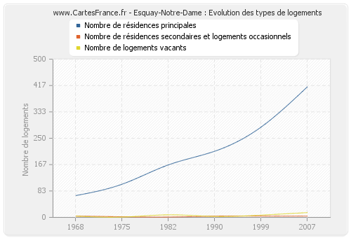 Les graphiques suivant reprennent l'historique du nombre et du type de logements d'Esquay-Notre-Dame de 1968 à 2007. Le deuxième graphique est tracé en interpolation cubique. Ceci permet d'obtenir plus précisément le nombre de logement du village d'Esquay-Notre-Dame les années ou aucun recensement n'a été effectué.