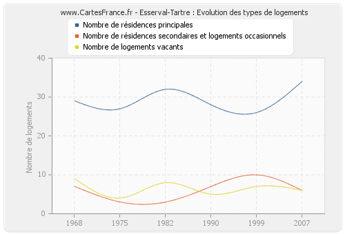 Les graphiques suivant reprennent l'historique du nombre et du type de logements d'Esserval-Tartre de 1968 à 2007. Le deuxième graphique est tracé en interpolation cubique. Ceci permet d'obtenir plus précisément le nombre de logement du village d'Esserval-Tartre les années ou aucun recensement n'a été effectué.