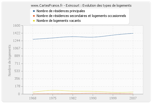Les graphiques suivant reprennent l'historique du nombre et du type de logements d'Exincourt de 1968 à 2007. Le deuxième graphique est tracé en interpolation cubique. Ceci permet d'obtenir plus précisément le nombre de logement de la ville d'Exincourt les années ou aucun recensement n'a été effectué.