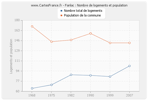 La population de Fanlac était de 142 habitants en 2007, 142 habitants en 1999, 158 habitants en 1990, 147 habitants en 1982, 144 habitants en 1975 et 170 habitants en 1968. Parallèlement, le nombre de logements de Fanlac était de 103 en 2007, 85 en 1999, 87 en 1990, 88 en 1982, 71 en 1975 et 65 en 1968.