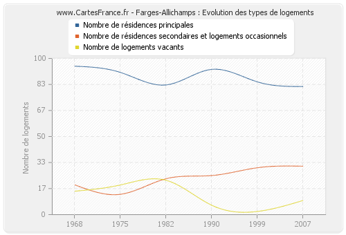Les graphiques suivant reprennent l'historique du nombre et du type de logements de Farges-Allichamps de 1968 à 2007. Le deuxième graphique est tracé en interpolation cubique. Ceci permet d'obtenir plus précisément le nombre de logement du village de Farges-Allichamps les années ou aucun recensement n'a été effectué.