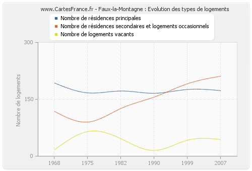 En 2007 les logements de Faux-la-Montagne étaient composés de 173 résidences principales, 211 résidences secondaires ou occasionnels ainsi que 44 logements vacants.