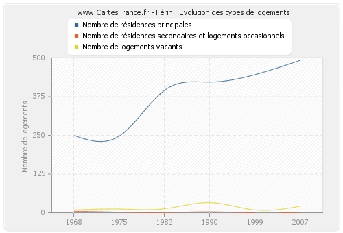 Les graphiques suivant reprennent l'historique du nombre et du type de logements de Férin de 1968 à 2007. Le deuxième graphique est tracé en interpolation cubique. Ceci permet d'obtenir plus précisément le nombre de logement du village de Férin les années ou aucun recensement n'a été effectué.