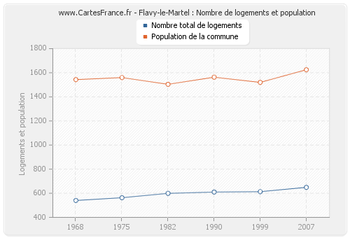 La population de Flavy-le-Martel était de 1 625 habitants en 2007, 1 520 habitants en 1999, 1 563 habitants en 1990, 1 504 habitants en 1982, 1 560 habitants en 1975 et 1 543 habitants en 1968. Parallèlement, le nombre de logements de Flavy-le-Martel était de 649 en 2007, 613 en 1999, 610 en 1990, 599 en 1982, 563 en 1975 et 540 en 1968.