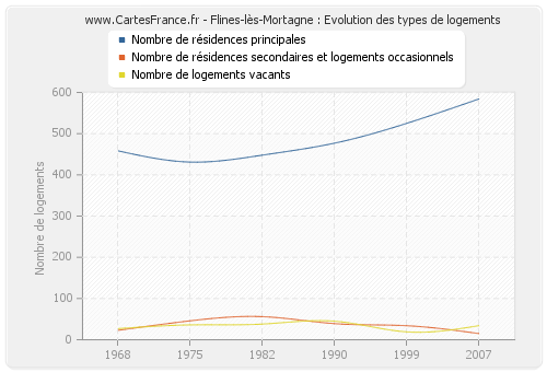 Les graphiques suivant reprennent l'historique du nombre et du type de logements de Flines-lès-Mortagne de 1968 à 2007. Le deuxième graphique est tracé en interpolation cubique. Ceci permet d'obtenir plus précisément le nombre de logement du village de Flines-lès-Mortagne les années ou aucun recensement n'a été effectué.