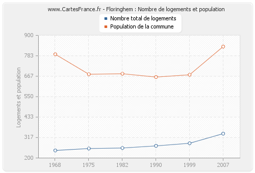 La population de Floringhem était de 836 habitants en 2007, 675 habitants en 1999, 662 habitants en 1990, 681 habitants en 1982, 678 habitants en 1975 et 792 habitants en 1968. Parallèlement, le nombre de logements de Floringhem était de 339 en 2007, 284 en 1999, 269 en 1990, 257 en 1982, 254 en 1975 et 243 en 1968.