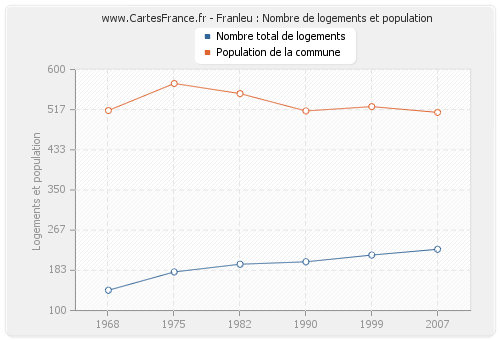 La population de Franleu était de 511 habitants en 2007, 523 habitants en 1999, 514 habitants en 1990, 550 habitants en 1982, 571 habitants en 1975 et 515 habitants en 1968. Parallèlement, le nombre de logements de Franleu était de 227 en 2007, 215 en 1999, 201 en 1990, 196 en 1982, 180 en 1975 et 142 en 1968.