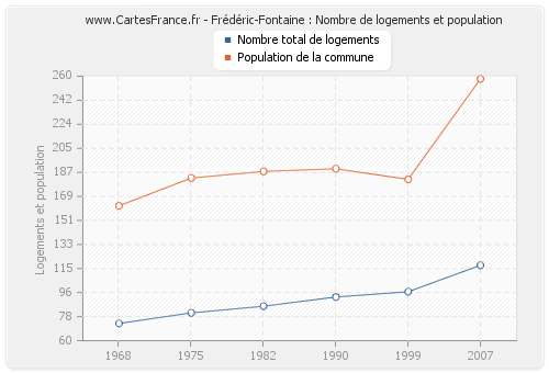 La population de Frédéric-Fontaine était de 258 habitants en 2007, 182 habitants en 1999, 190 habitants en 1990, 188 habitants en 1982, 183 habitants en 1975 et 162 habitants en 1968. Parallèlement, le nombre de logements de Frédéric-Fontaine était de 117 en 2007, 97 en 1999, 93 en 1990, 86 en 1982, 81 en 1975 et 73 en 1968.
