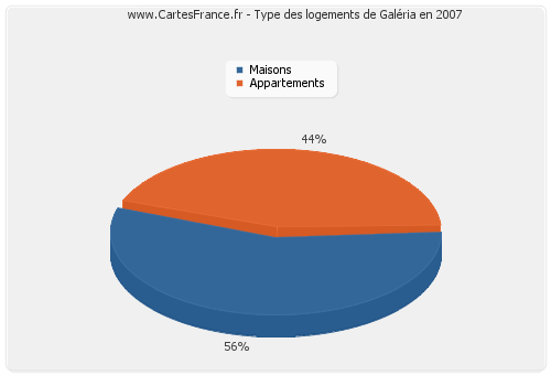 En 2007 les logements de Galéria étaient composés de 163 résidences principales, 297 résidences secondaires ou occasionnels ainsi que 14 logements vacants.