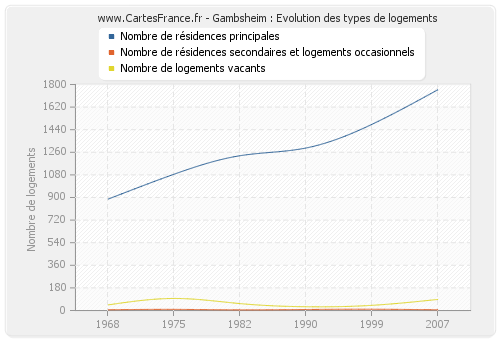 Les graphiques suivant reprennent l'historique du nombre et du type de logements de Gambsheim de 1968 à 2007. Le deuxième graphique est tracé en interpolation cubique. Ceci permet d'obtenir plus précisément le nombre de logement de la ville de Gambsheim les années ou aucun recensement n'a été effectué.