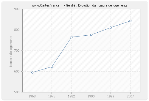 Le nombre de logements de Genillé était de 843 en 2007, 811 en 1999, 776 en 1990, 765 en 1982, 623 en 1975 et 595 en 1968.