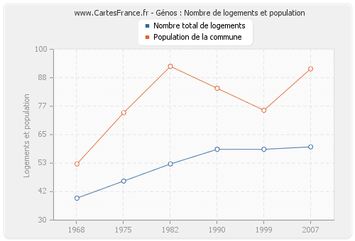 La population de Génos était de 92 habitants en 2007, 75 habitants en 1999, 84 habitants en 1990, 93 habitants en 1982, 74 habitants en 1975 et 53 habitants en 1968. Parallèlement, le nombre de logements de Génos était de 60 en 2007, 59 en 1999, 59 en 1990, 53 en 1982, 46 en 1975 et 39 en 1968.
