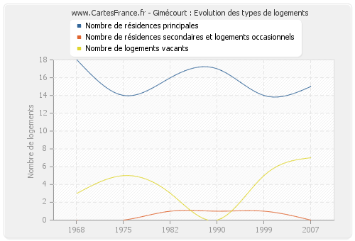 En 2007 les logements de Gimécourt étaient composés de 15 résidences principales, 0 résidences secondaires ou occasionnels ainsi que 7 logements vacants.