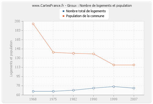 Le nombre de logements de Giroux était de 73 en 2007, 76 en 1999, 73 en 1990, 69 en 1982, 67 en 1975 et 67 en 1968.