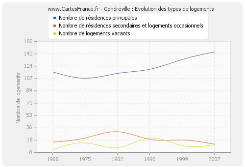 Les graphiques suivant reprennent l'historique du nombre et du type de logements de Gondreville de 1968 à 2007. Le deuxième graphique est tracé en interpolation cubique. Ceci permet d'obtenir plus précisément le nombre de logement du village de Gondreville les années ou aucun recensement n'a été effectué.