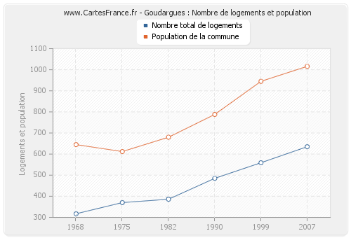 La population de Goudargues était de 1 016 habitants en 2007, 945 habitants en 1999, 788 habitants en 1990, 680 habitants en 1982, 612 habitants en 1975 et 645 habitants en 1968. Parallèlement, le nombre de logements de Goudargues était de 635 en 2007, 559 en 1999, 485 en 1990, 386 en 1982, 370 en 1975 et 317 en 1968.