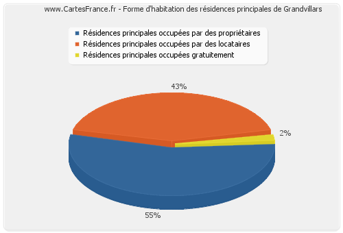 La Ville de Grandvillars recensait la même année un total de 1 299 ménages. Les graphiques suivants présentent les statistiques d'habitation de ces ménages de Grandvillars.