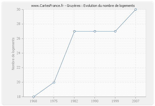Le nombre de logements de Gruyères était de 30 en 2007, 27 en 1999, 27 en 1990, 27 en 1982, 20 en 1975 et 18 en 1968.