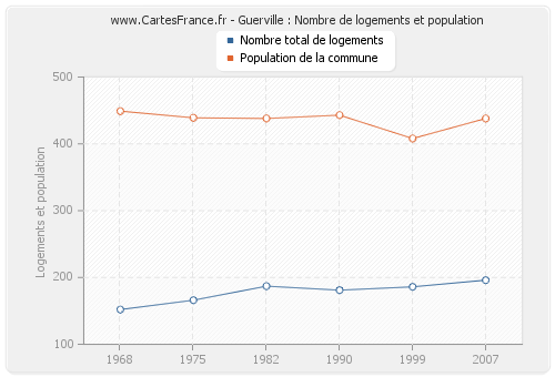 La population de Guerville était de 438 habitants en 2007, 408 habitants en 1999, 443 habitants en 1990, 438 habitants en 1982, 439 habitants en 1975 et 449 habitants en 1968. Parallèlement, le nombre de logements de Guerville était de 196 en 2007, 186 en 1999, 181 en 1990, 187 en 1982, 166 en 1975 et 152 en 1968.