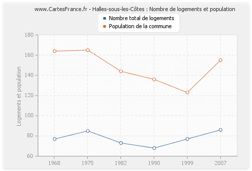 La population de Halles-sous-les-Côtes était de 155 habitants en 2007, 123 habitants en 1999, 136 habitants en 1990, 144 habitants en 1982, 165 habitants en 1975 et 164 habitants en 1968. Parallèlement, le nombre de logements de Halles-sous-les-Côtes était de 86 en 2007, 77 en 1999, 68 en 1990, 73 en 1982, 85 en 1975 et 77 en 1968.