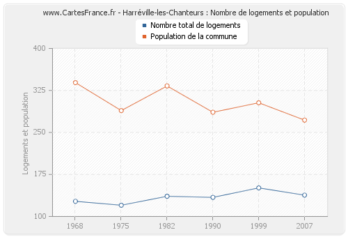 La population de Harréville-les-Chanteurs était de 272 habitants en 2007, 303 habitants en 1999, 286 habitants en 1990, 333 habitants en 1982, 289 habitants en 1975 et 339 habitants en 1968. Parallèlement, le nombre de logements de Harréville-les-Chanteurs était de 138 en 2007, 151 en 1999, 134 en 1990, 136 en 1982, 120 en 1975 et 127 en 1968.