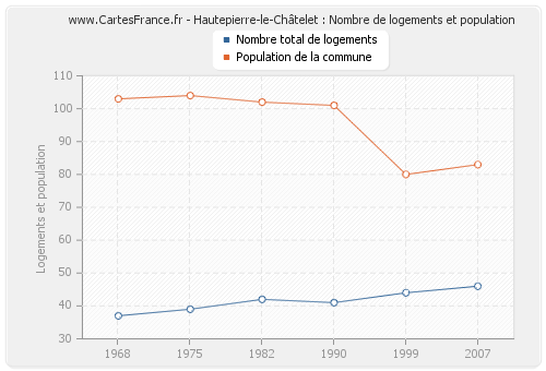 La population de Hautepierre-le-Châtelet était de 83 habitants en 2007, 80 habitants en 1999, 101 habitants en 1990, 102 habitants en 1982, 104 habitants en 1975 et 103 habitants en 1968. Parallèlement, le nombre de logements de Hautepierre-le-Châtelet était de 46 en 2007, 44 en 1999, 41 en 1990, 42 en 1982, 39 en 1975 et 37 en 1968.