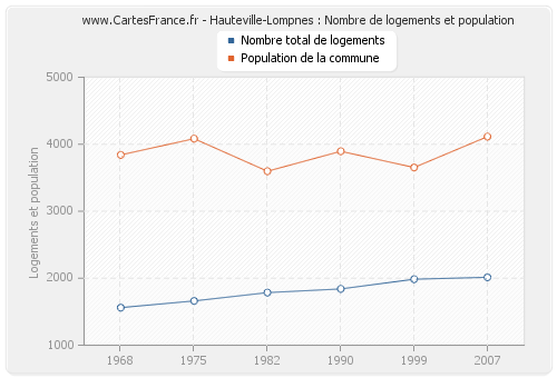 La population de Hauteville-Lompnes était de 4 114 habitants en 2007, 3 653 habitants en 1999, 3 895 habitants en 1990, 3 597 habitants en 1982, 4 083 habitants en 1975 et 3 841 habitants en 1968. Parallèlement, le nombre de logements de Hauteville-Lompnes était de 2 014 en 2007, 1 985 en 1999, 1 840 en 1990, 1 785 en 1982, 1 661 en 1975 et 1 561 en 1968.
