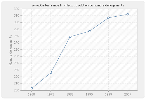 Historique du nombre de logements de Haux de 1968 à 2007 :