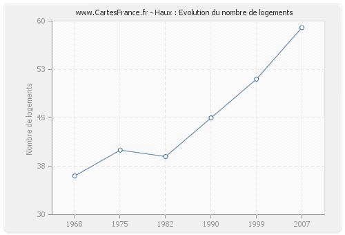 Le nombre de logements de Haux était de 59 en 2007, 51 en 1999, 45 en 1990, 39 en 1982, 40 en 1975 et 36 en 1968.
