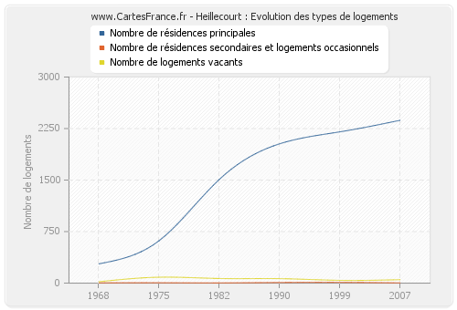 Les graphiques suivant reprennent l'historique du nombre et du type de logements de Heillecourt de 1968 à 2007. Le deuxième graphique est tracé en interpolation cubique. Ceci permet d'obtenir plus précisément le nombre de logement de la ville de Heillecourt les années ou aucun recensement n'a été effectué.