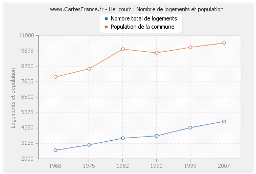 La population de Héricourt était de 10 457 habitants en 2007, 10 142 habitants en 1999, 9 742 habitants en 1990, 10 014 habitants en 1982, 8 578 habitants en 1975 et 7 987 habitants en 1968. Parallèlement, le nombre de logements de Héricourt était de 4 731 en 2007, 4 281 en 1999, 3 681 en 1990, 3 512 en 1982, 3 026 en 1975 et 2 632 en 1968.