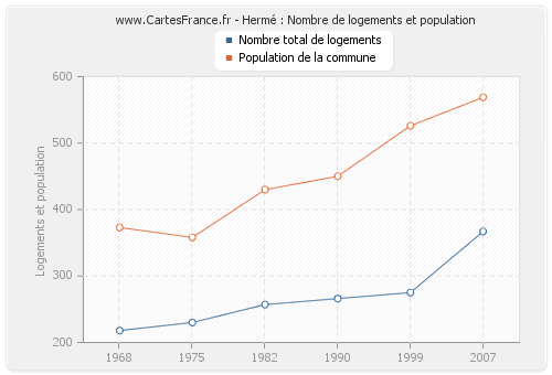 La population de Hermé était de 569 habitants en 2007, 526 habitants en 1999, 450 habitants en 1990, 430 habitants en 1982, 358 habitants en 1975 et 373 habitants en 1968. Parallèlement, le nombre de logements de Hermé était de 367 en 2007, 275 en 1999, 266 en 1990, 257 en 1982, 230 en 1975 et 218 en 1968.