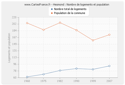 Historique du nombre de logements de Hesmond de 1968 à 2007 :