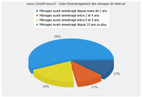 - Nombre de ménages de Hestrud ayant emménagé depuis 10 ans ou plus : 60