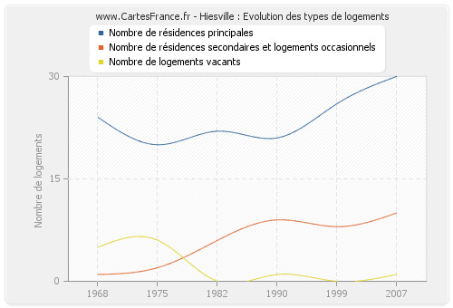 Les graphiques suivant reprennent l'historique du nombre et du type de logements de Hiesville de 1968 à 2007. Le deuxième graphique est tracé en interpolation cubique. Ceci permet d'obtenir plus précisément le nombre de logement du village de Hiesville les années ou aucun recensement n'a été effectué.