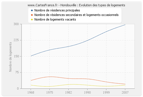 Les graphiques suivant reprennent l'historique du nombre et du type de logements de Hondouville de 1968 à 2007. Le deuxième graphique est tracé en interpolation cubique. Ceci permet d'obtenir plus précisément le nombre de logement du village de Hondouville les années ou aucun recensement n'a été effectué.